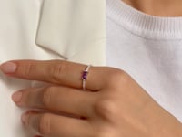 Précieuse avec pierre d'améthyste et zircons, aussi délicate que surprenante. La pierre d'améthyste mesure 5x2,5 mm, et l'épaisseur de la bague est de 1,5 mm.