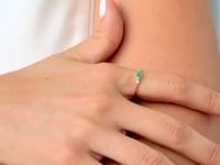 Cette bague raffinée présente une pierre centrale en émeraude naturelle de 0,17 ct, avec une taille marquise mesurant 5x2 mm. L'éclat de l'émeraude est accentué par deux diamants naturels totalisant 0,014 ct, chacun avec une taille ronde de 1,30 mm et une clarté SI, ajoutant une touche subtile d'élégance.