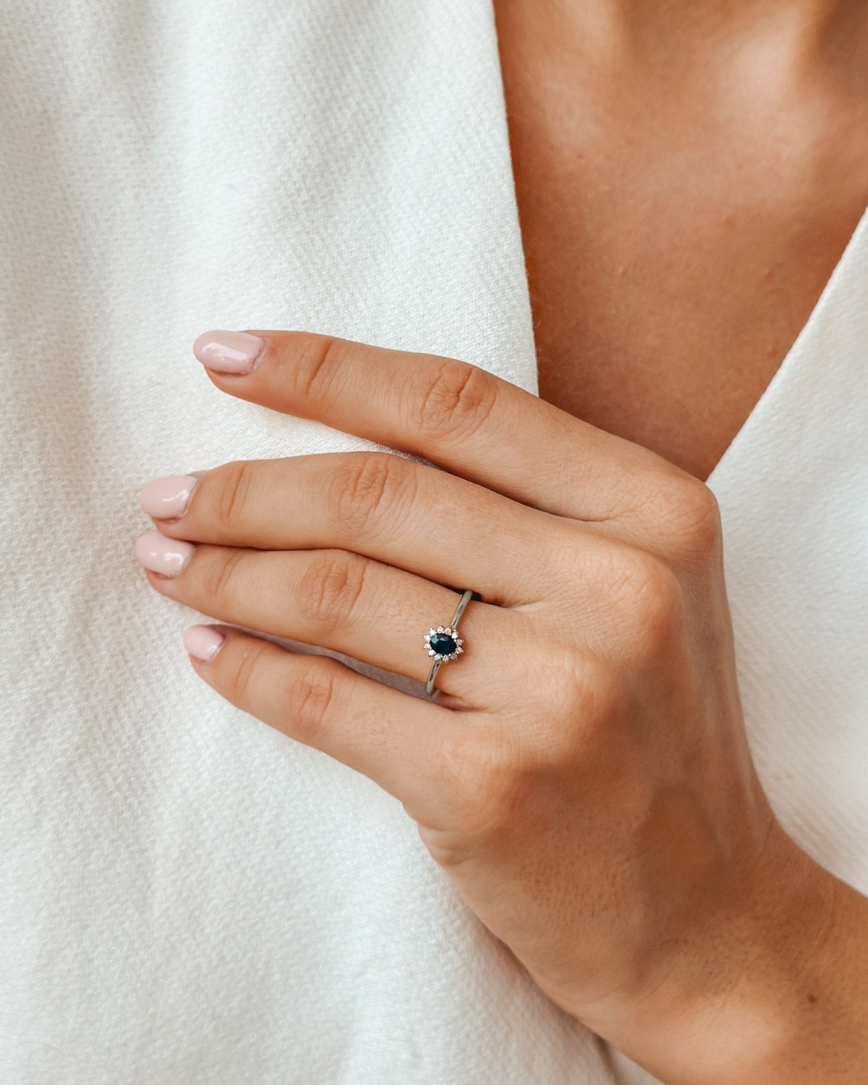 Une bague classique avec une touche royale, réalisée en or blanc 14K et ornée d'un saphir ovale intense, entourée de diamants ronds totalisant 0,06 ct
