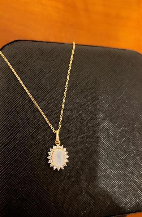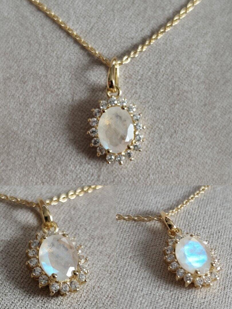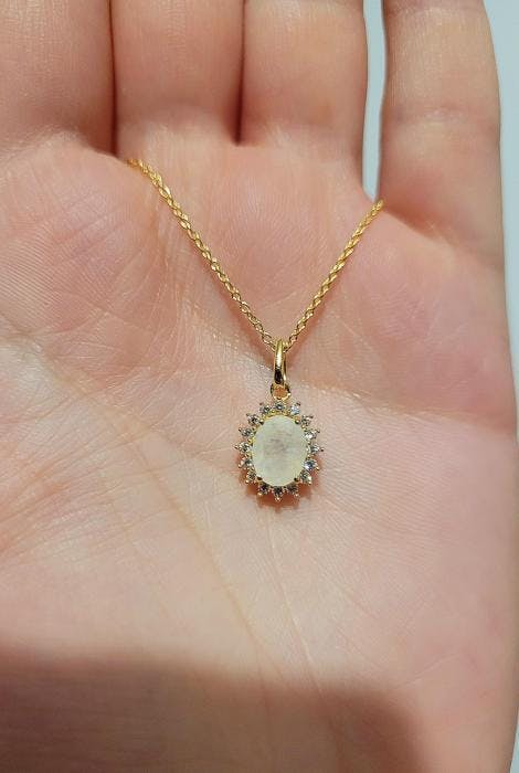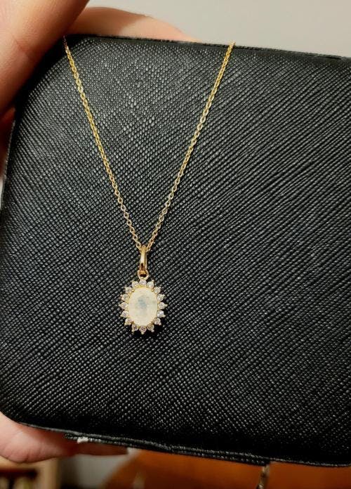 This necklace is a meticulously crafted piece of jewelry, made from natural Moonstone and small sparkling zircon stones. The pendant measures 9 x 6 mm, and the necklace length is 45 cm, extendable up to 50 cm.