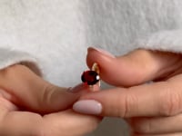 The garnet stone is 9 mm high and 7 mm wide, and the ring band plated with 14K yellow gold is encrusted with zirconia stones.